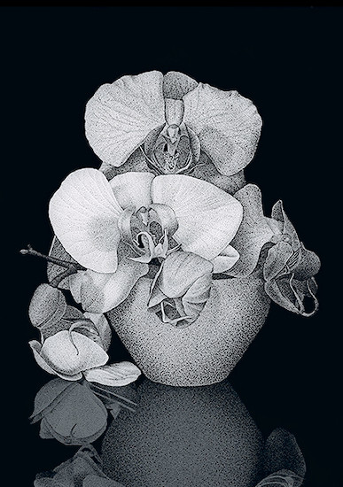 In Kooperation mit dem Institut für moderne Kunst präsentiert die Oechsner Galerie Werke des Künstlers, die eben erschienene Publikation "Thilo Westermann - Vanitas" und die mit dem Modeunternehmen Escada entwickelte Modekollektion "Escada meets Thilo Westermann". Thilo Westermann (*1980, lebt in München) setzt seine eleganten Hinterglas-Stilllebenmotive von Hand in einzelnen Punkten hinter eine Plexiglasscheibe. Im Auge des Betrachters verdichten sich die Punkte in Grauabstufungen und lassen die Hinterglasmalereien wie eine Hochglanzfotografie aussehen. Die aktuelle Modekollektion ESCADA MEETS THILO WESTERMANN, die die zweidimensionale Bildfläche der Malerei in die dreidimensionale Sprache der Kleidung überführt, bewegt sich exakt am Schnittpunkt von Kunst und Design. In der Ausstellung Stilblüten in der Oechsner Galerie zeigt Westermann die Symbiose seiner hinter Glas gemalten Preziosen und den vergrößerten Unikatdrucken mit den Escada Kollektionsteilen.