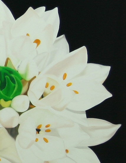 Weiße, zuweilen blendend weiße Blütenpaare vor dunklem, teils tiefschwarzem Hintergrund bilden das verbindende Motiv der aktuellen Arbeiten. Wie frühere Werke mit Blumen, Fischen und Wolken im Mittelpunkt erscheinen die Gemälde auf den ersten Blick als wertvoll aufbereitete, realistische Abbildungen vertrauter Motive. Doch bei näherer Betrachtung wird deutlich, dass es sich um komplexe, artifizielle Bildschöpfungen handelt. Faul lässt die Fotografien, die ihm statt Skizzen als Ausgangsmaterial dienen, weit hinter sich. Im Wechselspiel von Schärfe und Unschärfe, von leeren und gefüllten Flächen eröffnen sich neue Farbwirkungen und Bildräume. Der meditative Entstehungsprozess der Arbeiten wird ebenso spürbar wie die Einladung an den Betrachter, selbst über das Gesehene zu reflektieren.