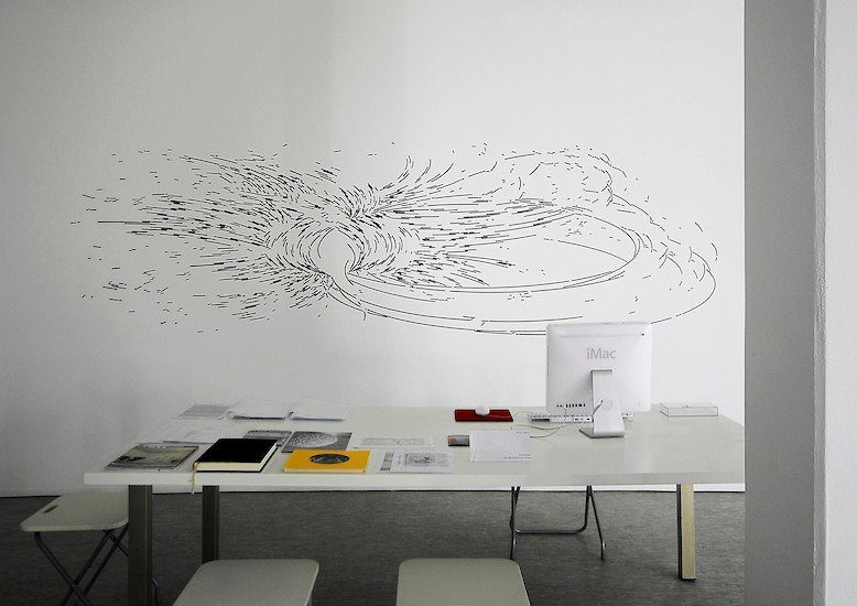 Für seine Zeichnungen führt der Künstler mit Hilfe einer Ellipsen-Schablone den Tuschepinsel über die Wand bzw. das Papier. Die Zeichnungen sind also keineswegs computergeneriert, wie es auf den ersten Blick erscheinen mag - allerdings durchaus Ergebnis der Beschäftigung mit dem Computer. "Es reizt mich besonders, Zwischenpositionen einzunehmen", sagt Mayer, "zwischen Computerzeichnung und Freihandzeichnung beispielsweise, da sich aus solch einer Haltung heraus mit Leichtigkeit Vorstöße in die verschiedensten Richtungen unternehmen lassen." Zu den jüngsten Vorstößen gehören "Plots": sie basieren auf Tuschezeichnungen und werden mit Hilfe eines computergesteuerten Folienschnitts an Wand oder Decke "gedruckt" – wie im Aufgang zur Oechsner Galerie.