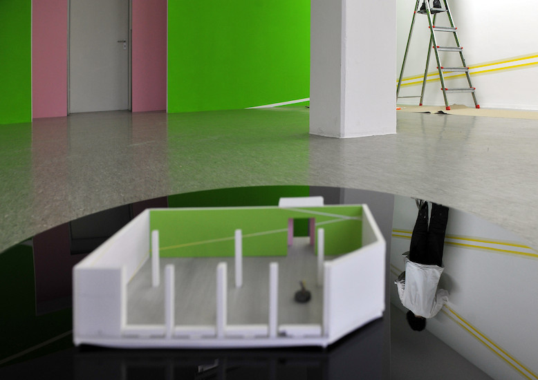In der Oechsner Galerie hat sich Christian Faul nun erstmals vom zweidimensionalen Bildträger gelöst und den gesamten Galerieraum als Bildraum genutzt. Der Künstler hat innerhalb von zwei Wochen in Situ das dreidimensionale Raum-Bild "tirza" realisiert.